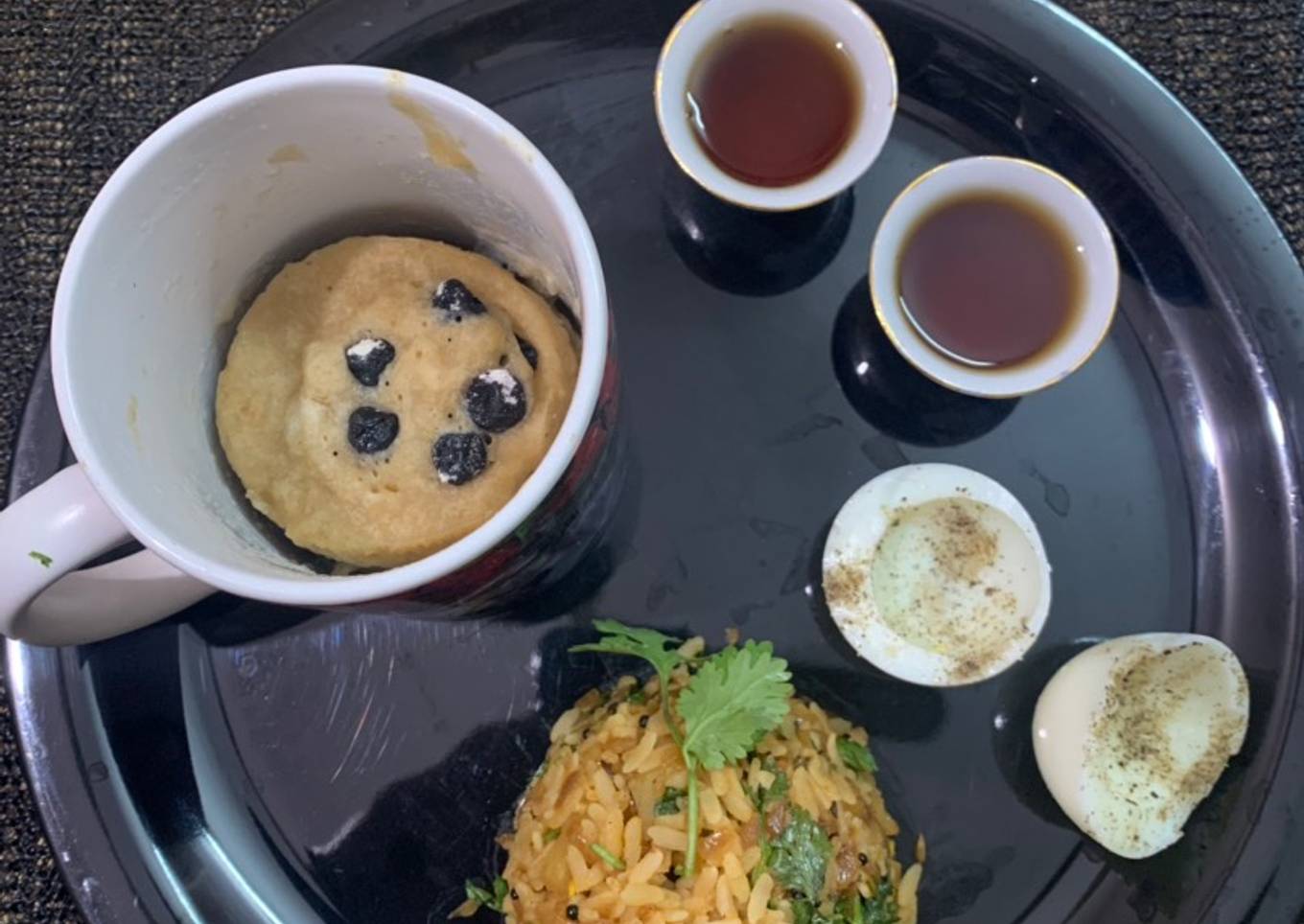 Chinese poha with bluberry mug pancake boiled egg and black coffee with tips for boiling eggs