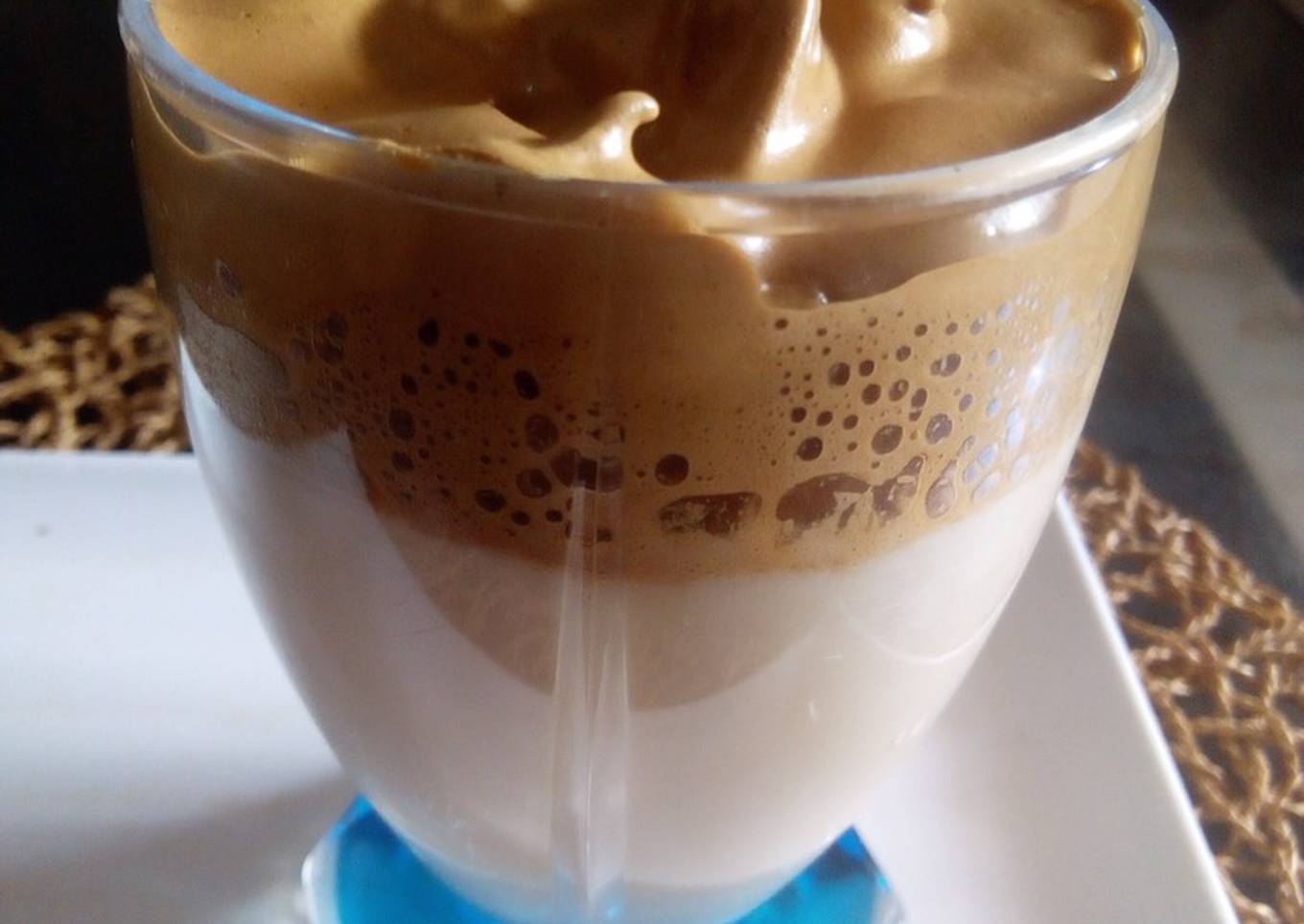 - Pour your milk and ice, top with the frothy coffee mixture in the iced milk. Stir and drink. Enjou😘