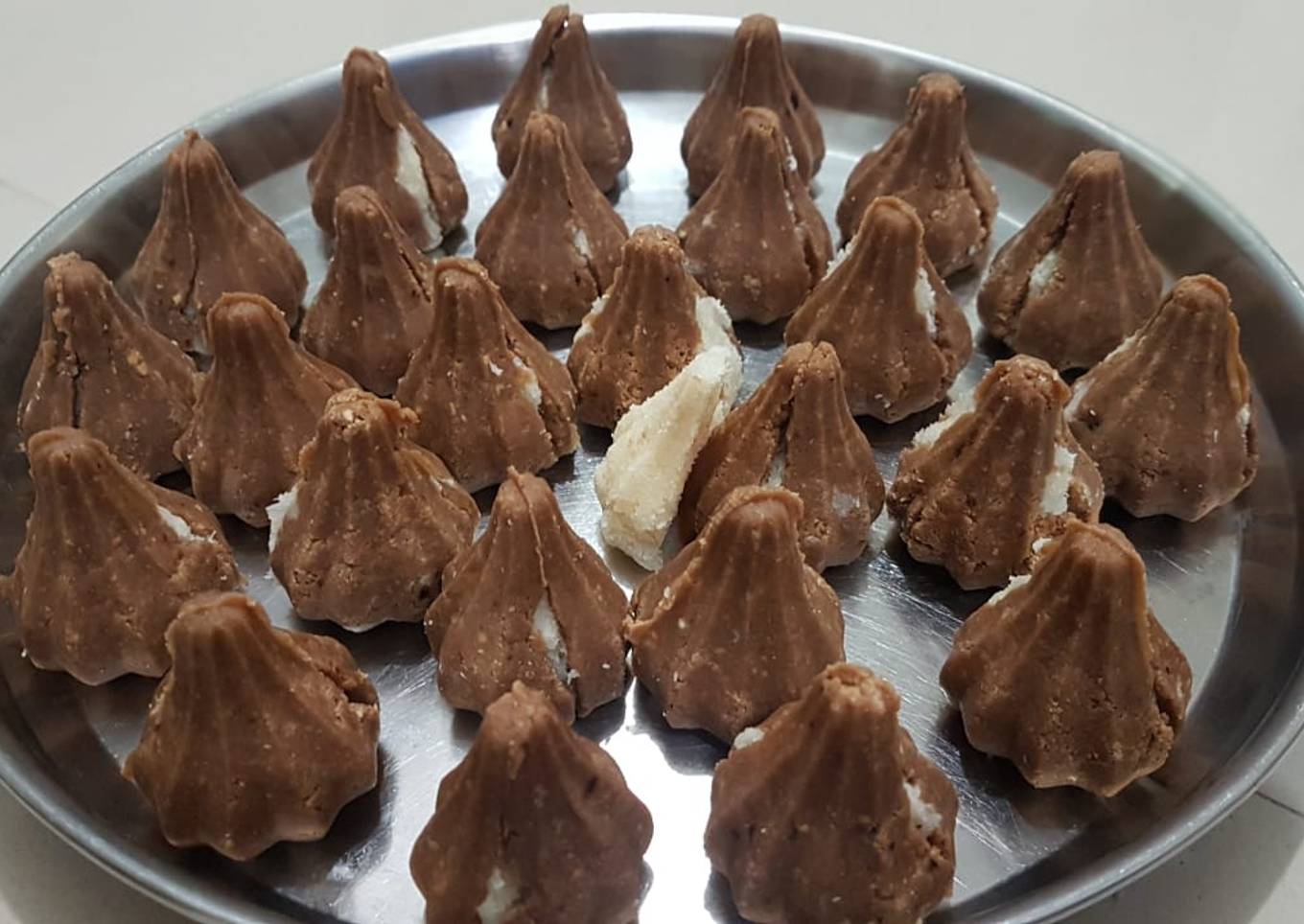 - Modak ka mould leke pehle biscuit wala dough rakhie dono side fir bich me coconut ka mixer rakh ke press kar lijie.