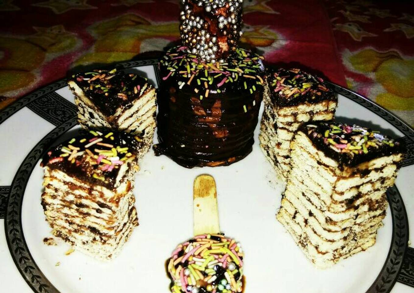 - Ab chocolate ka icing banaya tha wo biscuit tower pe spread karein uper se