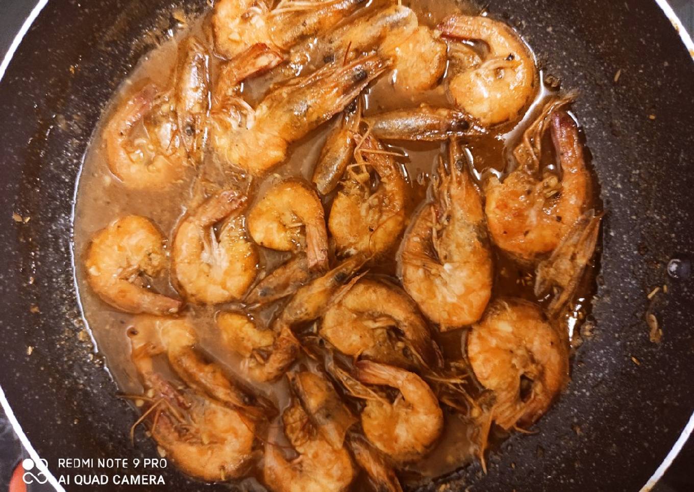 - Stir sauce until thickened, then put back the prawns, add salt and pepper to taste.