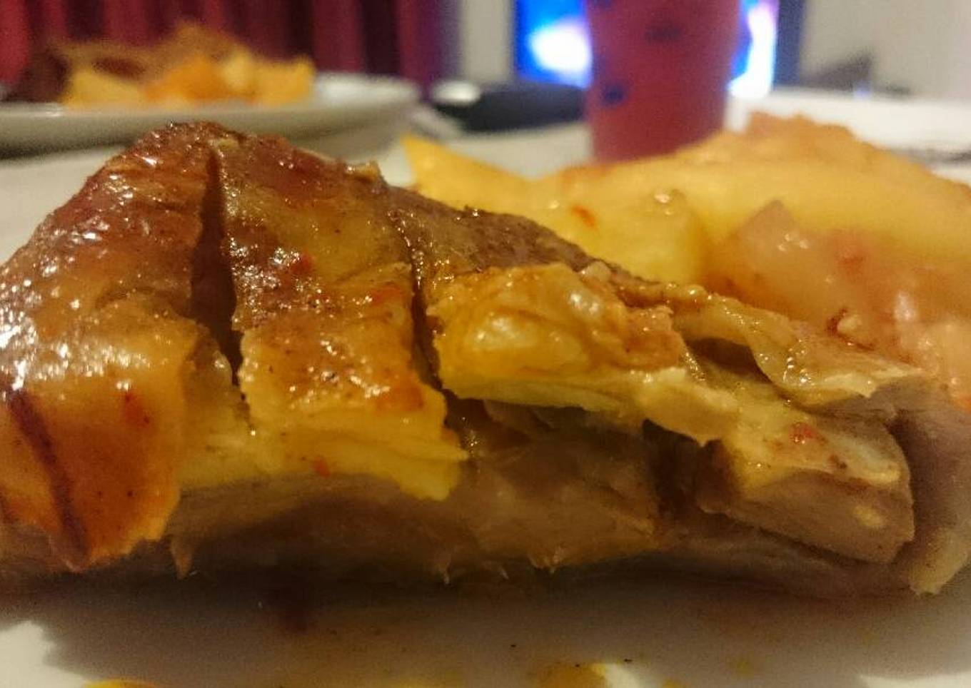 - Peel and cut the potatoes and onions in quarters and add them to the oven proof dish. While cooking the potatoes will absorb the marinade and flavour of the meat.