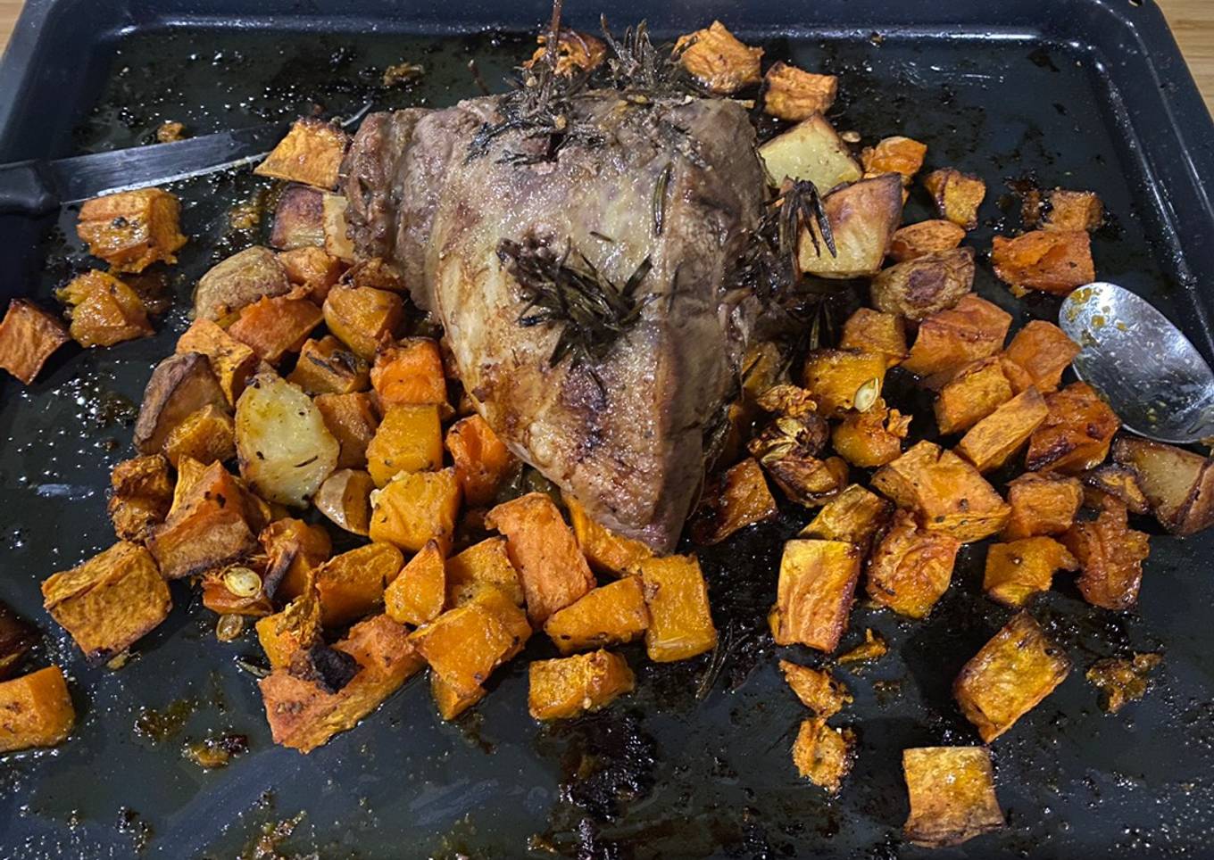 - Add the lamb leg and chopped up root veg of your choice to a roasting tray