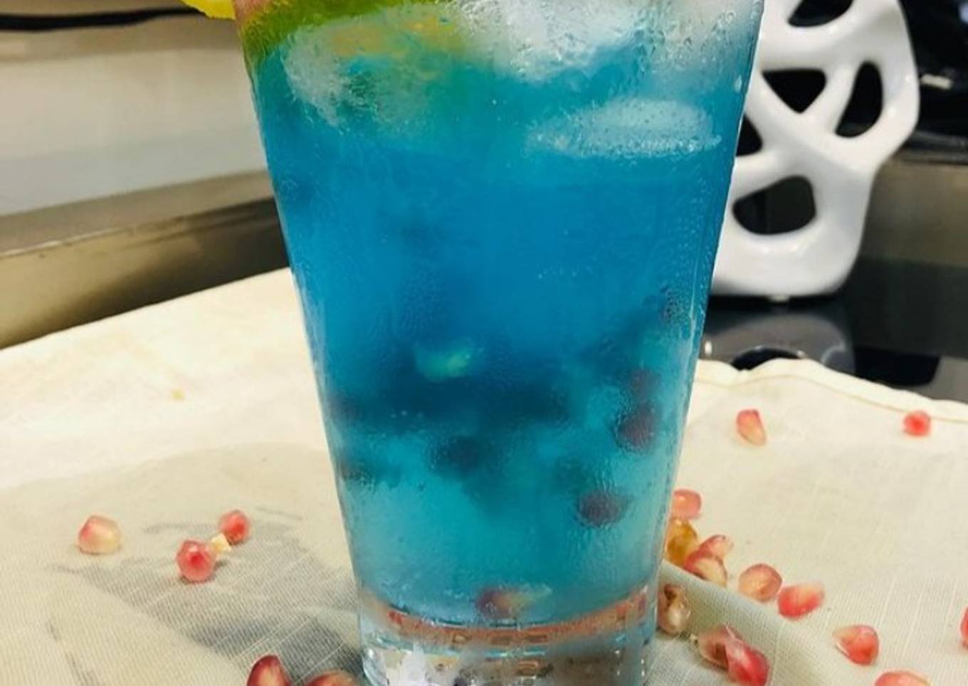 - In a cup add ice cubes, curacao syrup, dew + sprite stir then add a drop of sugar syrup, lemon juice more ice cubes stir make a toppings with lemon slice enjoy