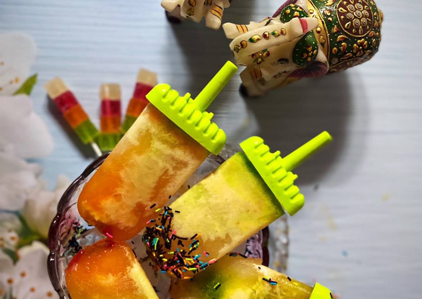 - Finally next day take out the popsicles where you can see clearly coloured ice crystal formation. The taste is a combination of lemon with a punch of orange and milky taste with bites of mangoes and jellies. It just took few minutes to finish it off. For decoration you can use some chocolate and rainbow sprinkles.