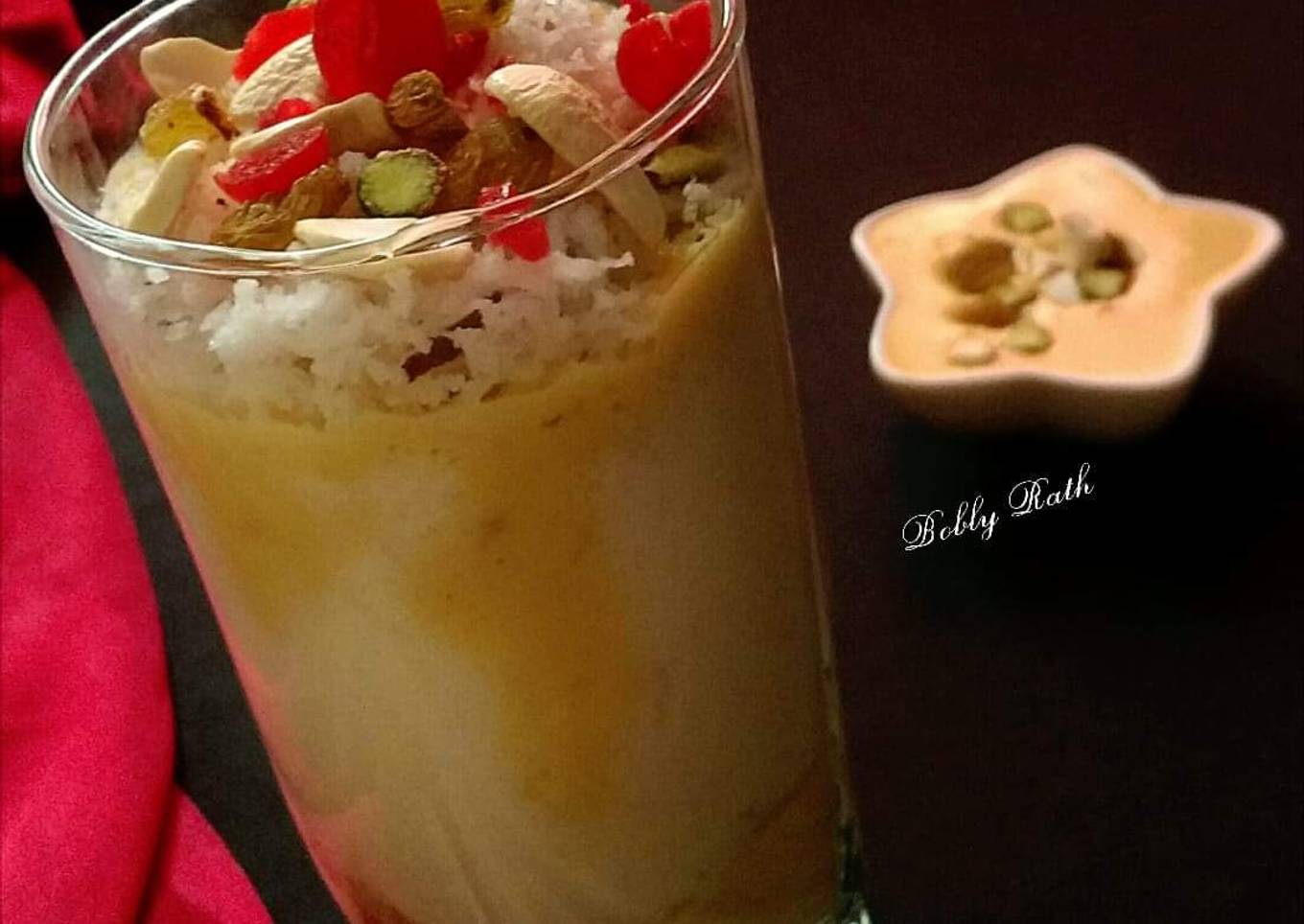 - Put grated coconut over the curd and again pour rest of the rabdi and dry fruits.