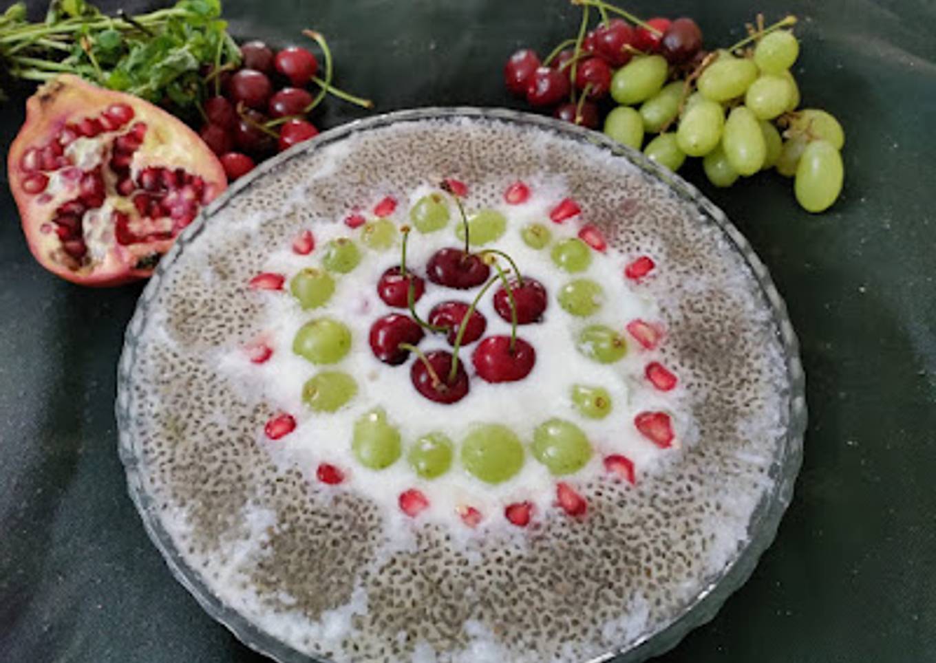 Soak chia seeds in water for 3 - 4 hours. - Mixed fruit raita, is ready,garnish with pomegranate pearls cherry,apple and chia seeds.