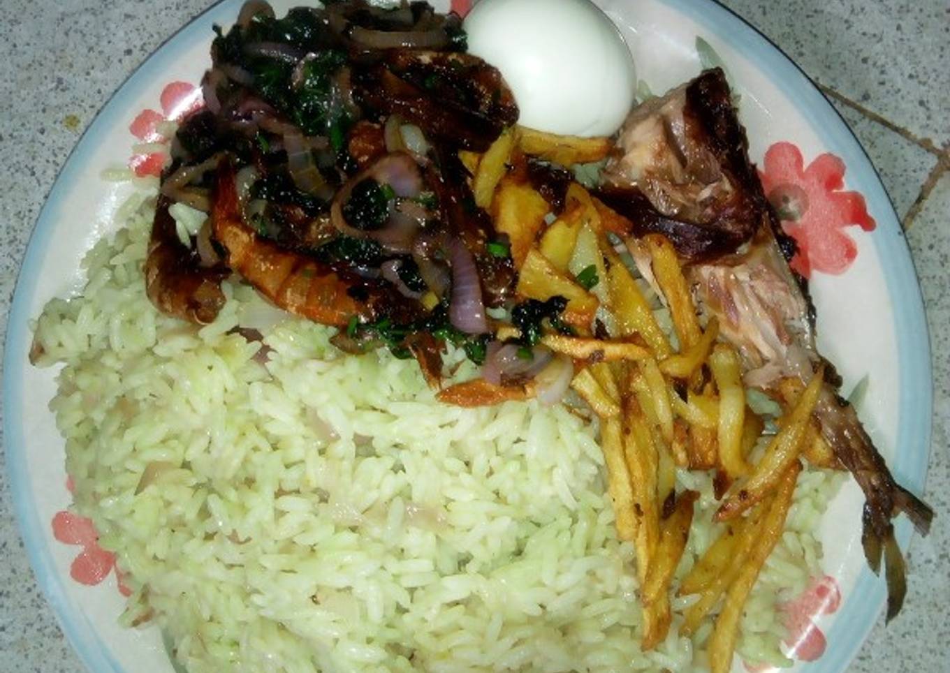 - cups of rice, oil, prawns, egg, fish, vegetable, curry, spices, salt and seasoning.