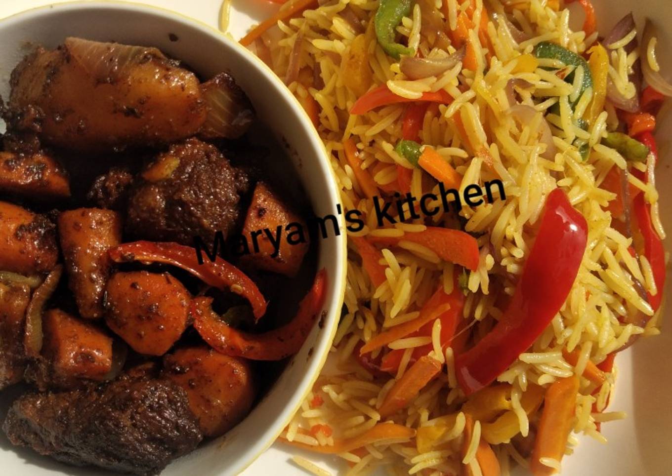 Stir fried vegetable rice and pan grilled beef